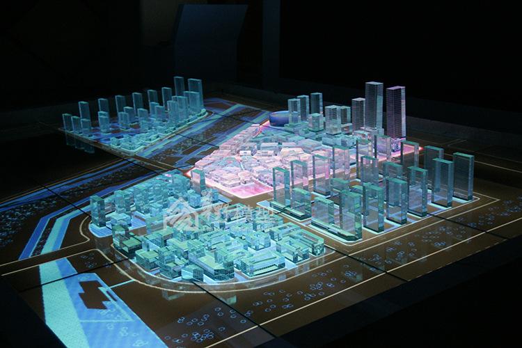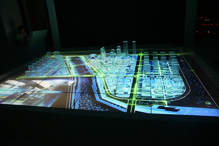 水晶沙盘是指将建筑模型用水晶材质进行加工制作,按规划的布局和位置合理置于超窄边LCD液晶拼接屏拼接而成的沙盘底座上,表面覆盖水晶模型,根据其反光折射的光特性,展现底座影片和光影效果,通过控制面板,结合模型,将沙盘的影音等信息在联动大屏幕上播放,同时墙面交互式LED全彩显示屏支持笔触控、手指触控以及离屏精准遥控,可实现与模型互动,交互效果非常震撼。