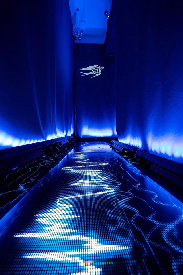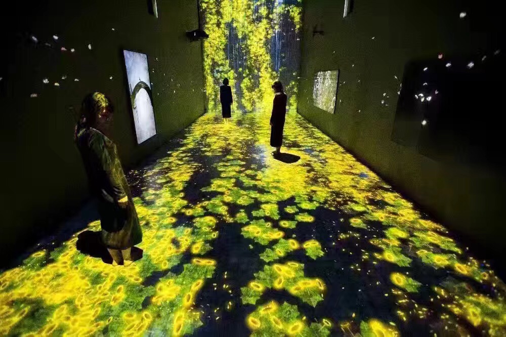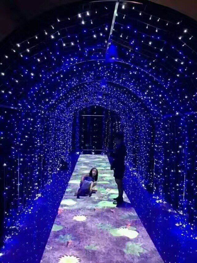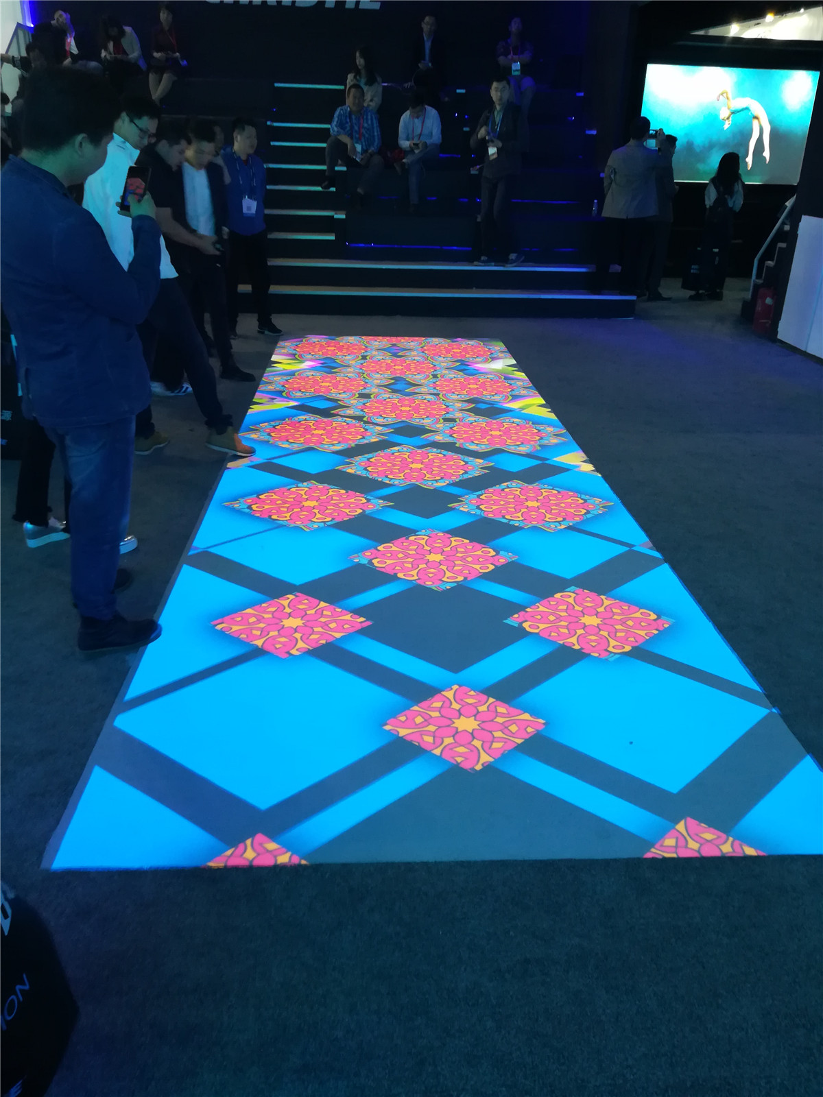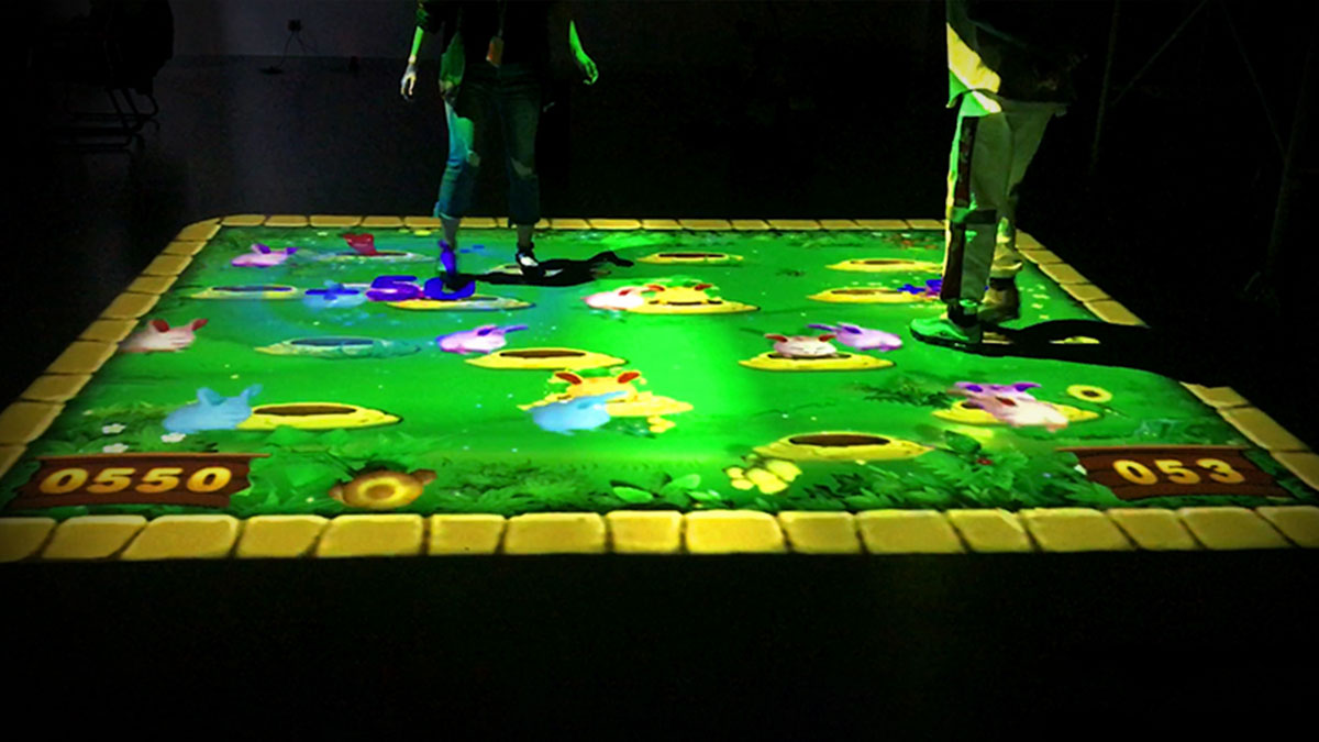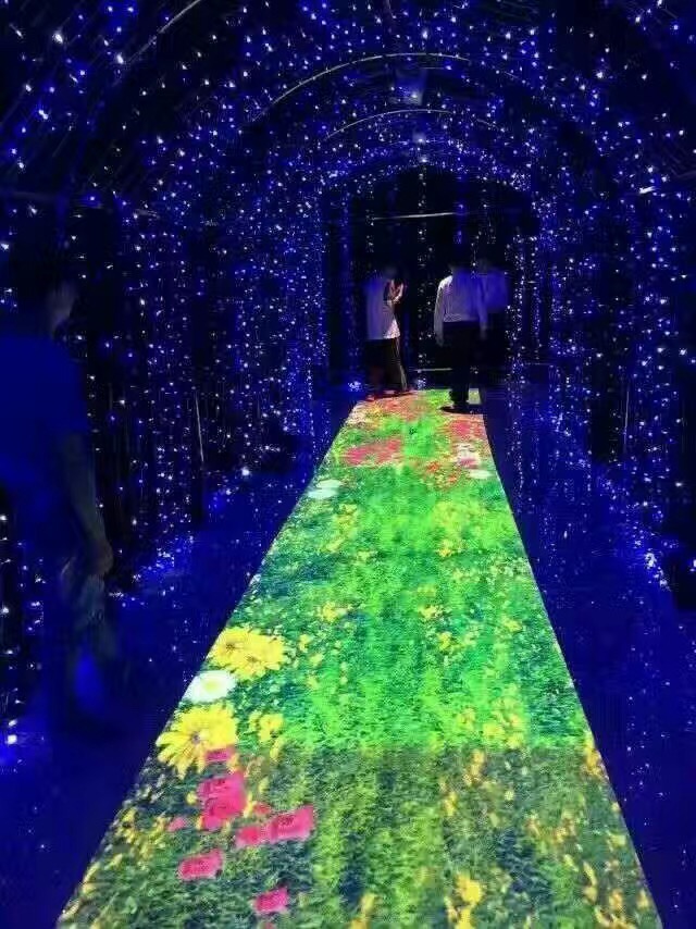 地面互动投影采用悬挂在顶部的投影设备把影像效果投射到地面,当参访着走至投影区域时,通过系统识别,参访者可以直接使用双脚或动作与投影幕上的虚拟场景进行交互,互动效果就会随着你的脚步产生相应的变幻。地面互动投影系统是集虚拟仿真技术、图像识别技术于一身的互动投影项目,包括水波纹、翻转、碰撞、擦除、避让、跟随等表现形式。观众通过身体动作来与地面的图像进行互动,各种特效影像在脚下绽放,带来一种全新的奇特的体验。