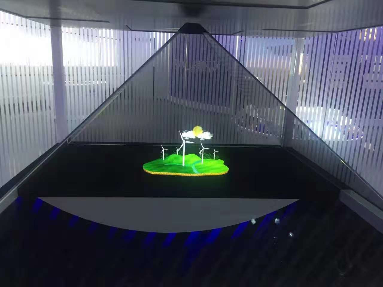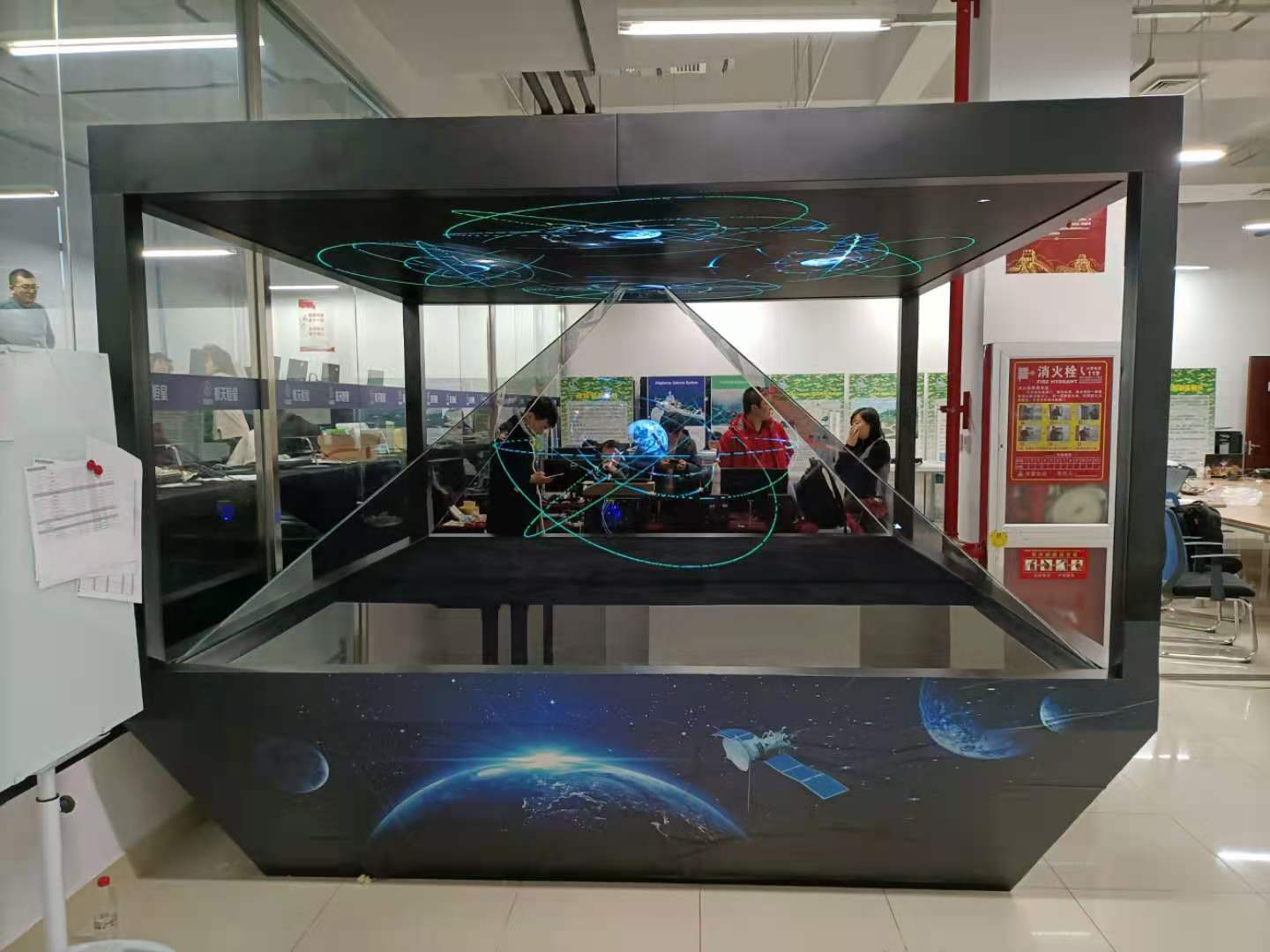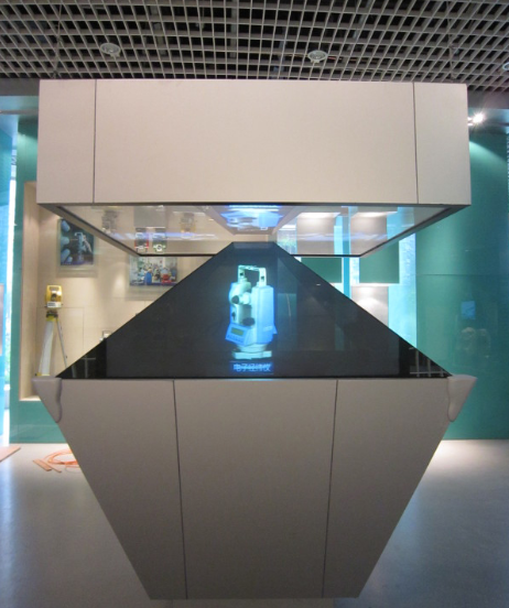 全息立体成像系统柜体的外观时尚美观,具有科技感 。其顶端四面透明,真正的空间成像色彩鲜艳,对比度、清晰度都较高,空间感、透视感较强。柜体上方形成的空中幻象中间可结合实物,实现影像与实物的结合。
