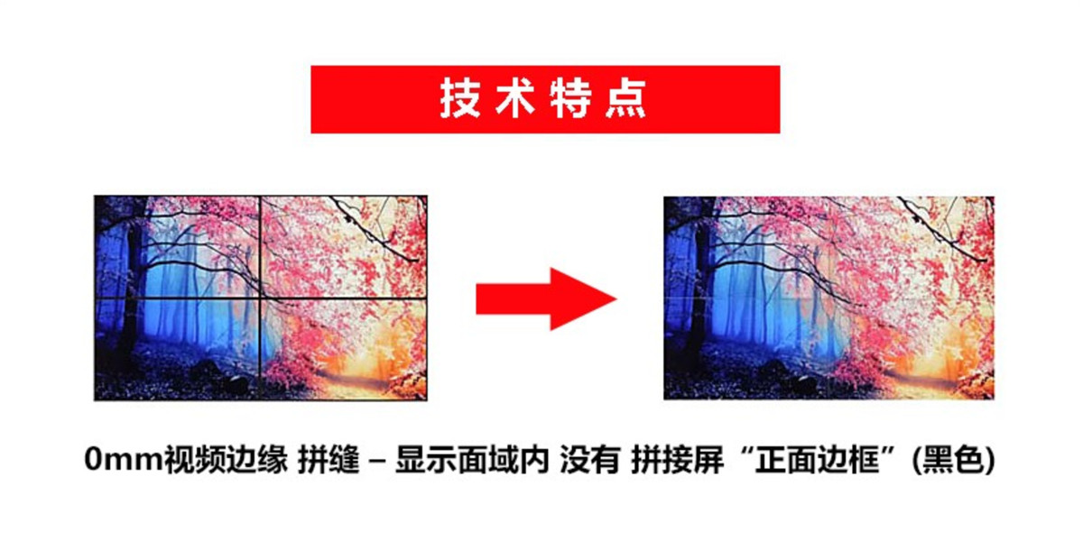 3、液晶无缝显示拼接—显示区域内没有拼接屏的“正面边缘黑色”