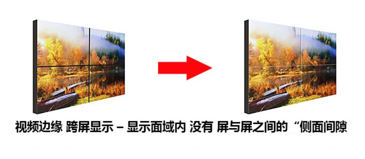 液晶面板边缘像素跨屏融合同步显示,彻底消除了屏与屏之间“侧面间隙”留下的黑带;因此,液晶拼接大屏幕是一个即无“正面边框”,又无“侧面间隙”的纯平无边框“全无缝”液晶拼接大屏幕,实现从边缘显示到跨屏显示的飞跃。