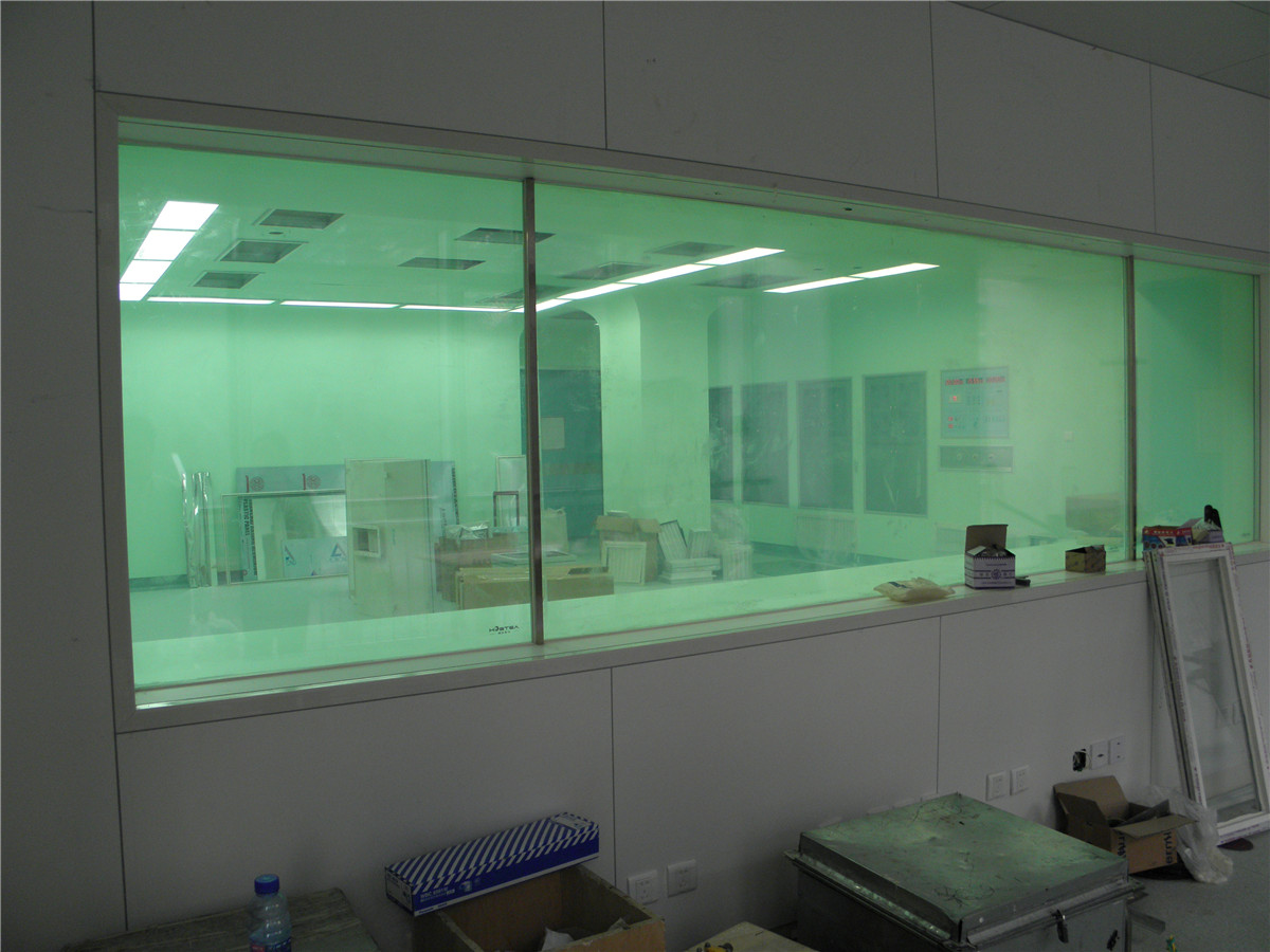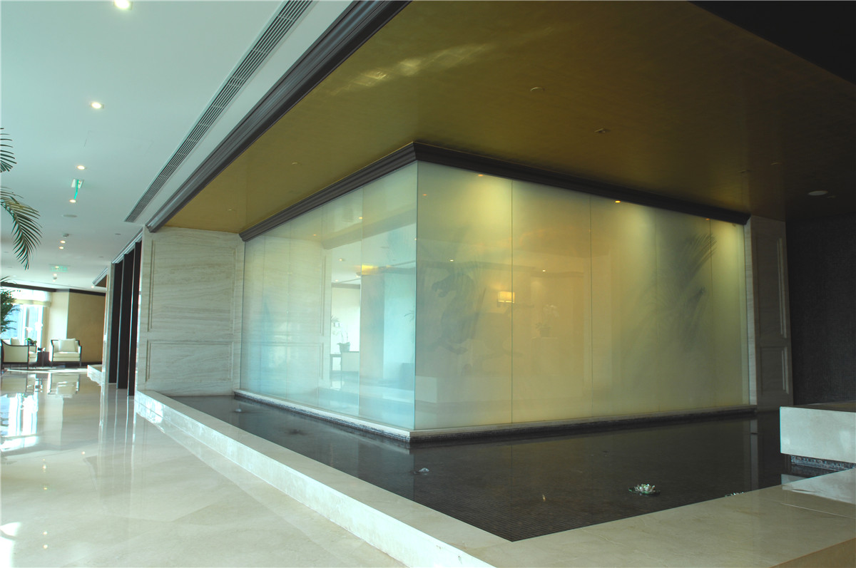 电控玻璃幕又称调光玻璃幕电控玻璃窗帘,通过特殊调光膜中的液晶电光效应控制使之散射(透光不透明)态和透射(透明)态之间变化。这一变化实现了玻璃的通透性和保护隐私的双重要求。可为展馆提供双向使用,观看内容时使用者的隐私。将新型液晶材料附着于玻璃上,透过电流变化来控制玻璃颜色深浅程度及调节阳光照入室内的强度,可阻隔约99%的光线及紫外线,提供使用者舒适的环境,属于电子技术与玻璃技术深入发展之高科技结合。
