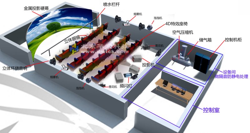 核心设备:立体投影系统、投影融合系统、音响系统、融合系统、特效控制系统、立体影片